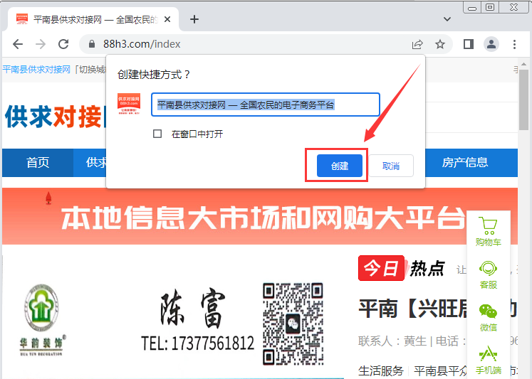 3、在弹出的窗口中,可在输入框修改想要保存快捷方式的标题名称,然后点击“创建”。
